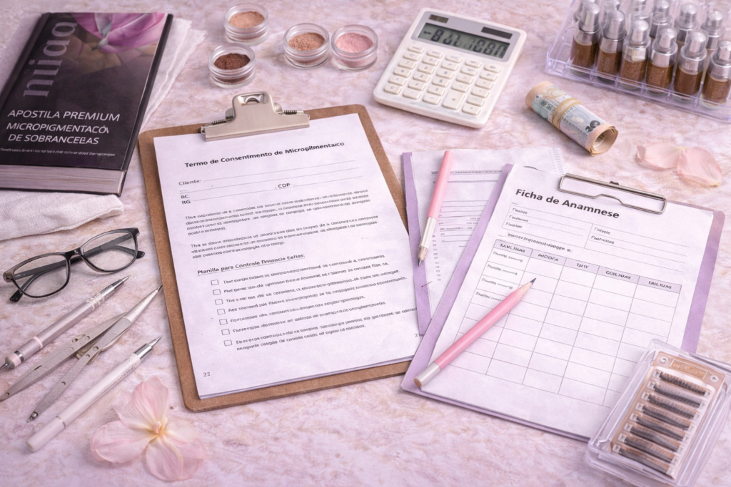 Lista completa de materiais para você montar seu kit de micropigmentação sem erro — com indicações em 3 faixas de preço (barato, intermediário e premium).