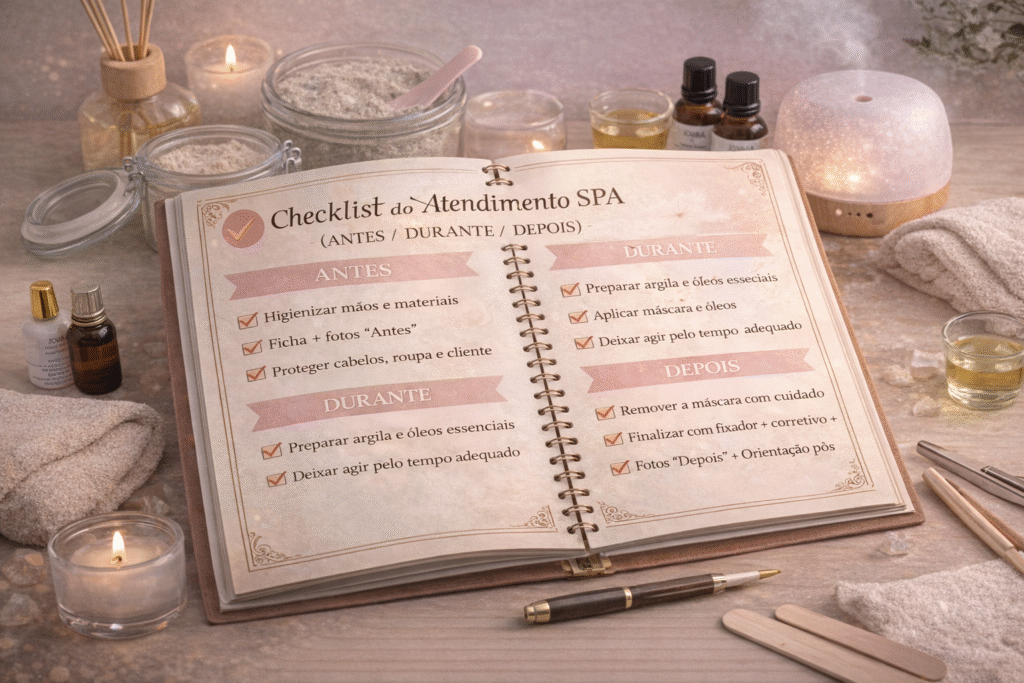 Organize argila + ativos + itens de aplicação. Em poucos minutos você deixa tudo pronto pra executar o SPA com padrão profissional.