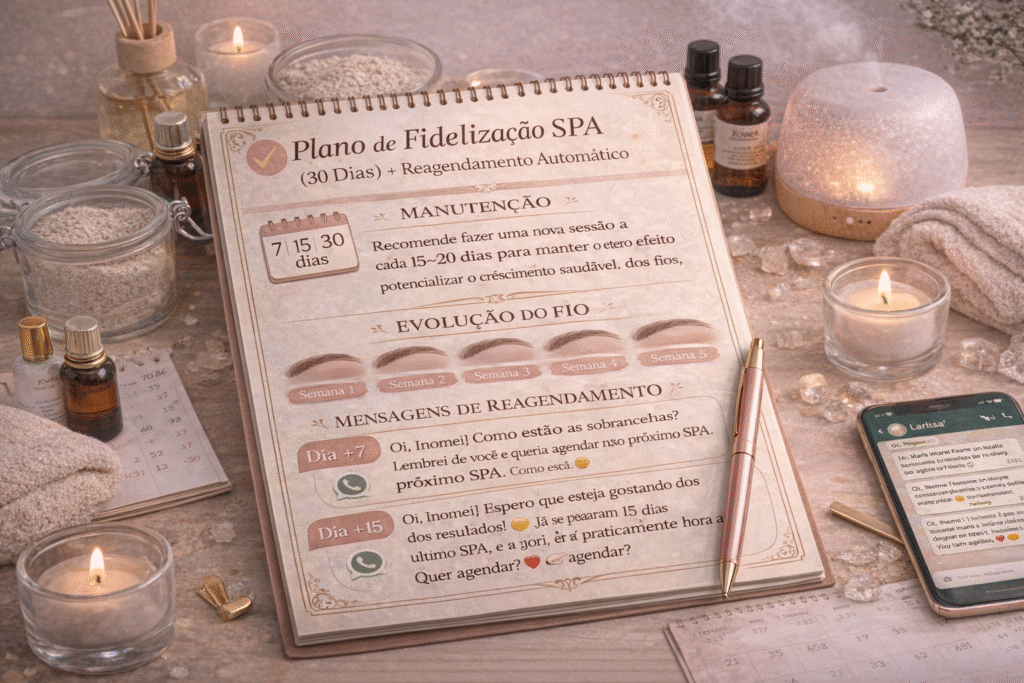 Use o plano de 30 dias + mensagens prontas de pós e reagendamento pra fazer a cliente voltar e transformar o SPA em recorrência.