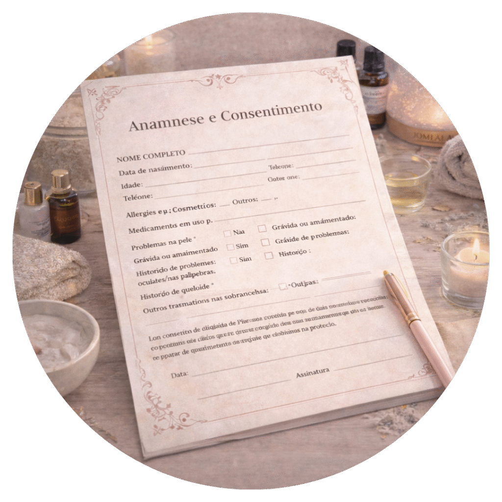Uma folha prática para você seguir o atendimento sem esquecer nenhuma etapa: higienização, preparo, aplicação, tempo de pausa, remoção, finalização, fotos e orientações pós. Ideal para padronizar seu resultado e ganhar mais segurança.