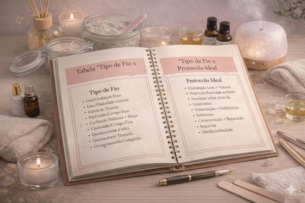 Tabela rápida para decidir o melhor protocolo para cada caso (fio ressecado, oleoso, fino/ralo, com falhas). Você aplica com mais precisão e personaliza o atendimento com cara de “premium”.